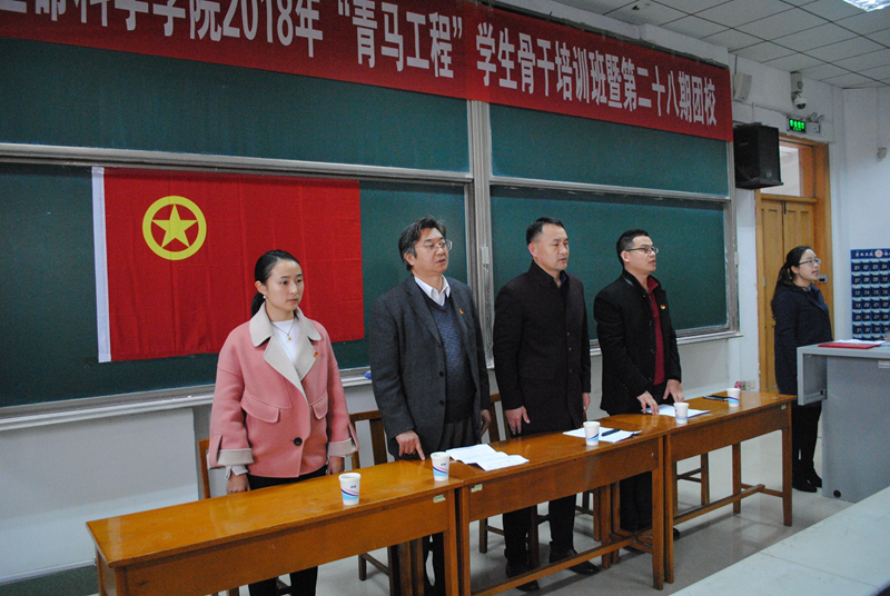 开幕仪式伊始,与会人员集体高唱团歌,彰显我院学子青春向上的精神风貌。随后赵强老师在开班仪式上代表我院党委对培训班的开班表示热烈的祝贺,并指出学习宣传贯彻总书记重要讲话精神是我院当前和今后一个时期的重要政治任务。通过赵书记的讲话,同学们能更加认识到青年马克思主义培训的意义所在,认识到自己的时代责任感,努力做我院追求卓越的示范者、良好学风的引导者、丰富校园文化的践行者。随后,由刘洪铎老师介绍了2018年“青马工程”大学生骨干培训班培养方案和学习计划。他提出我院同学要以“青马工程”为起点,积极响应号召,积极投身于这一伟大时代的建设,实现人生目标。学生代表杨晓雯同学发言,中国特色社会主义事业需要一代又一代有志青年持续奋斗,我院同学应珍惜本次来之不易的学习、锻炼机会。开幕式最后我院党委副书记赵强老师为学校党委宣传部副部长杨正运老师颁发聘书。